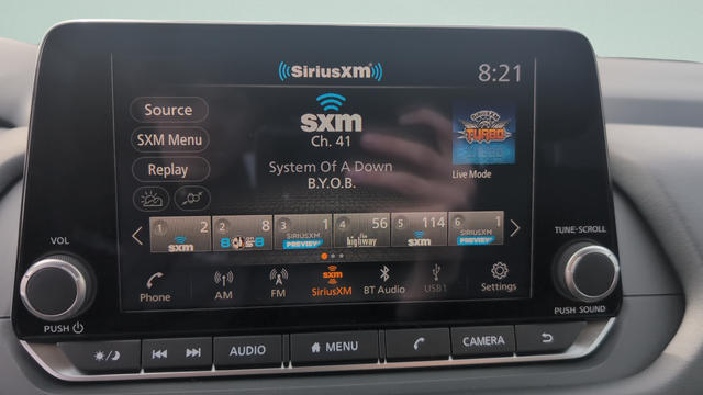 - Radio: AM/FM NissanConnect -inc: 6 speakers plus 2 tweeters, Apple CarPlay, Android Auto, 8" color touch screen display, Bluetooth®, 2 front USB type-C, Wi-Fi hotspot and NissanConnect Services powered by SiriusXM